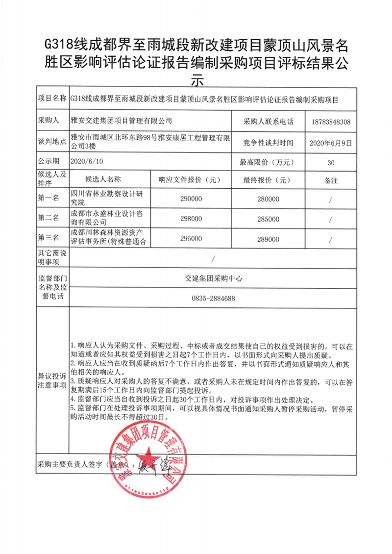雅安交建集團(tuán)項(xiàng)目管理有限公司G318線成都界至雨城段新改建項(xiàng)目蒙頂山風(fēng)景名勝區(qū)影響評(píng)估論證報(bào)告編制采購(gòu)項(xiàng)目評(píng)標(biāo)結(jié)果公示