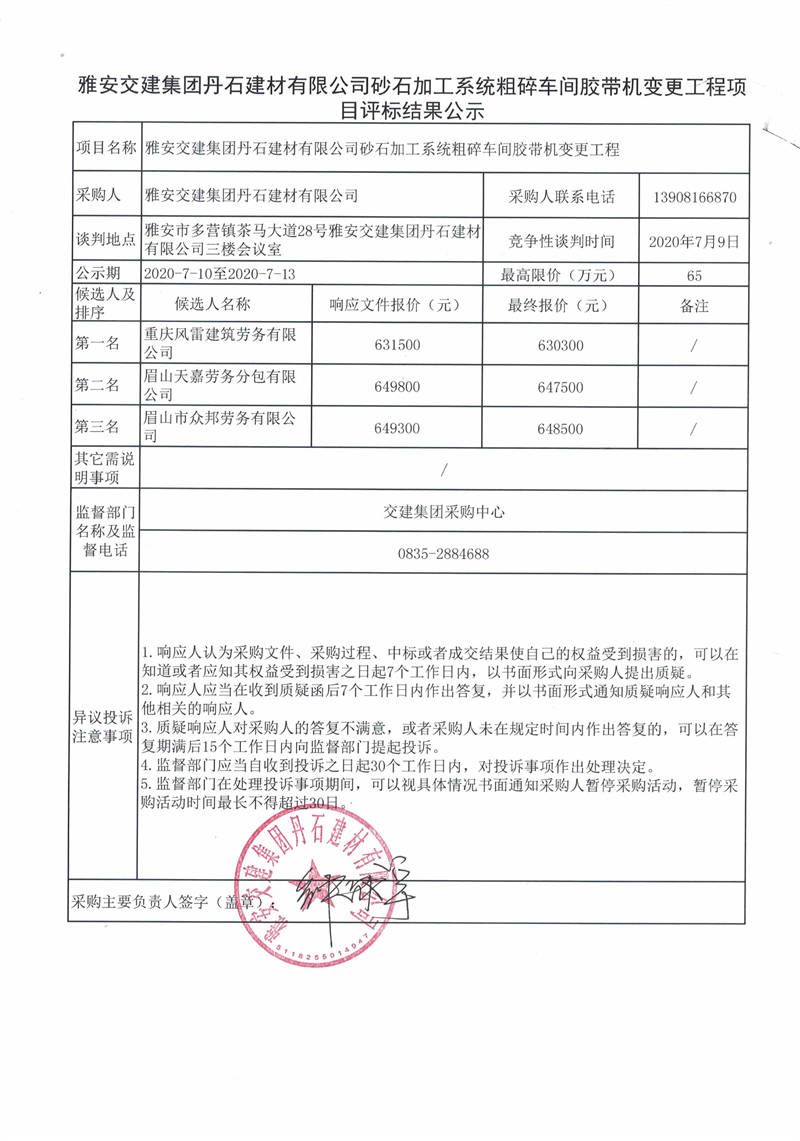 雅安交建集團丹石建材有限公司砂石加工系統(tǒng)粗碎車間膠帶機變更工程項目評標(biāo)結(jié)果公示