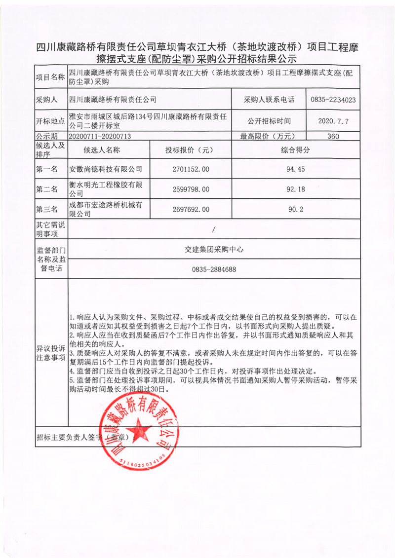 四川康藏路橋有限責任公司草壩青衣江大橋(茶地坎渡改橋)項目工程摩擦擺式支座(配防塵罩)采購公開招標結果公示