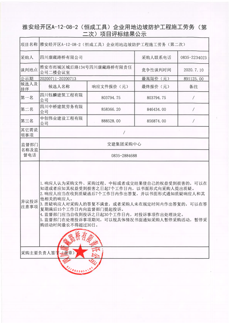四川康藏路橋有限公司雅安經(jīng)開區(qū)A-12-08-2(恒成工具)企業(yè)用地邊坡防護工程施工勞務(第二次)項目評標結(jié)果公示