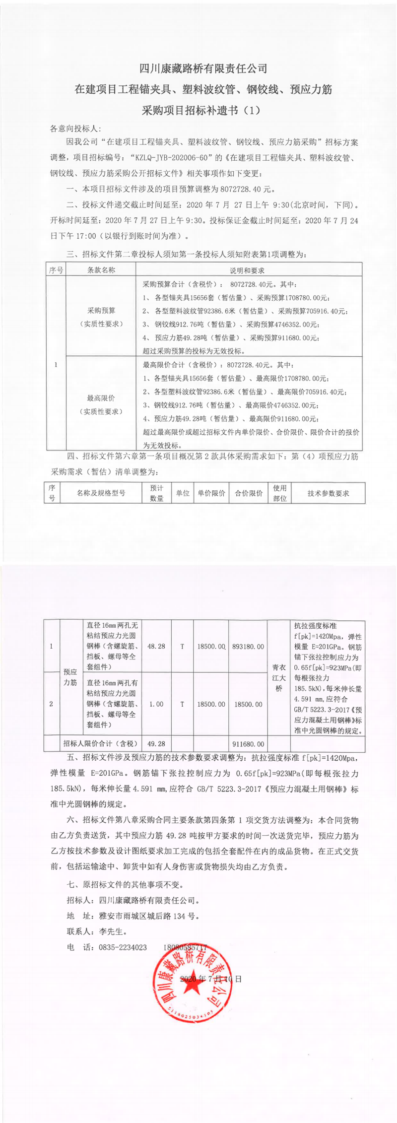 四川康藏路橋有限責任公司在建項目工程錨夾具、塑料波紋管、鋼鉸線、預應力筋采購項目招標補遺書(1)