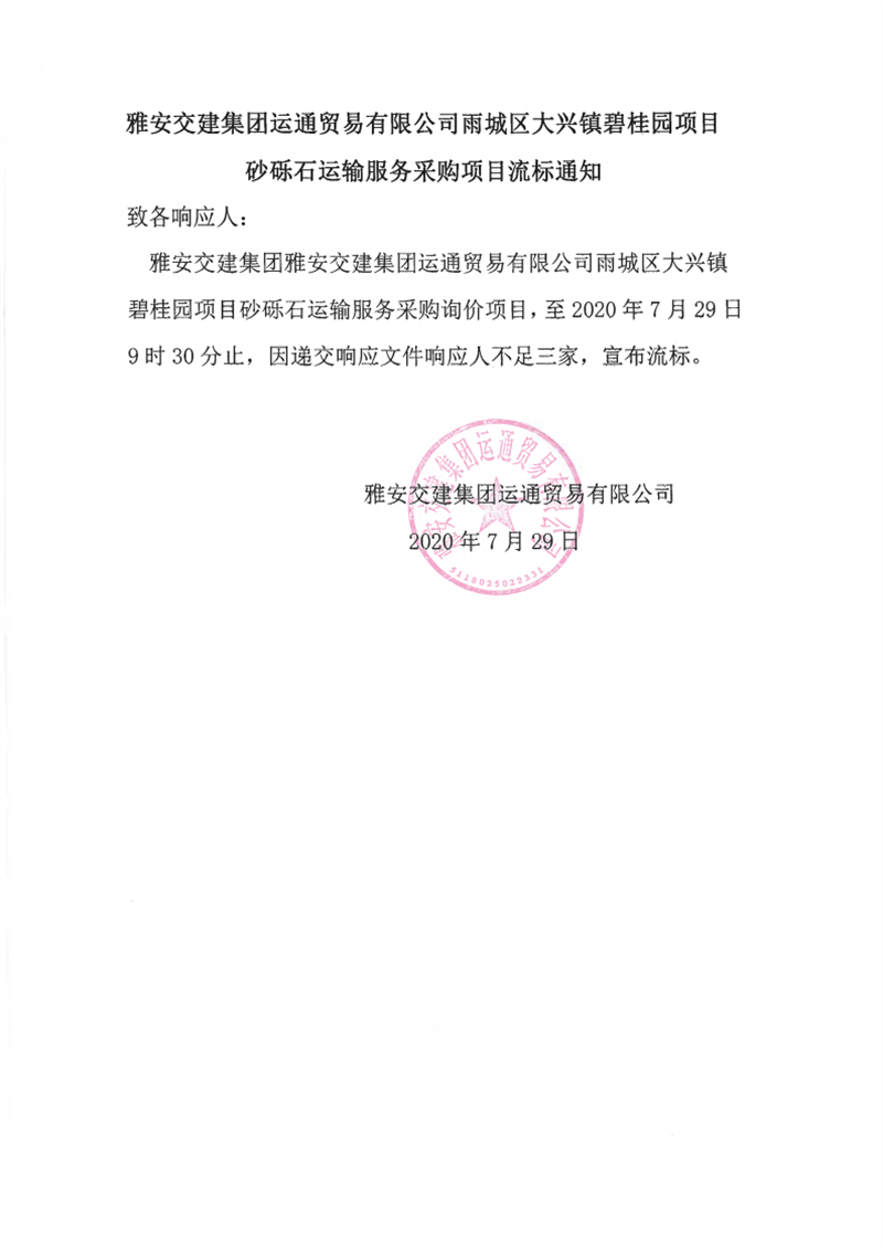 雅安交建集團運通貿(mào)易有限公司雨城區(qū)大興鎮(zhèn)碧桂園砂礫石運輸服務(wù)采購項目流標通知