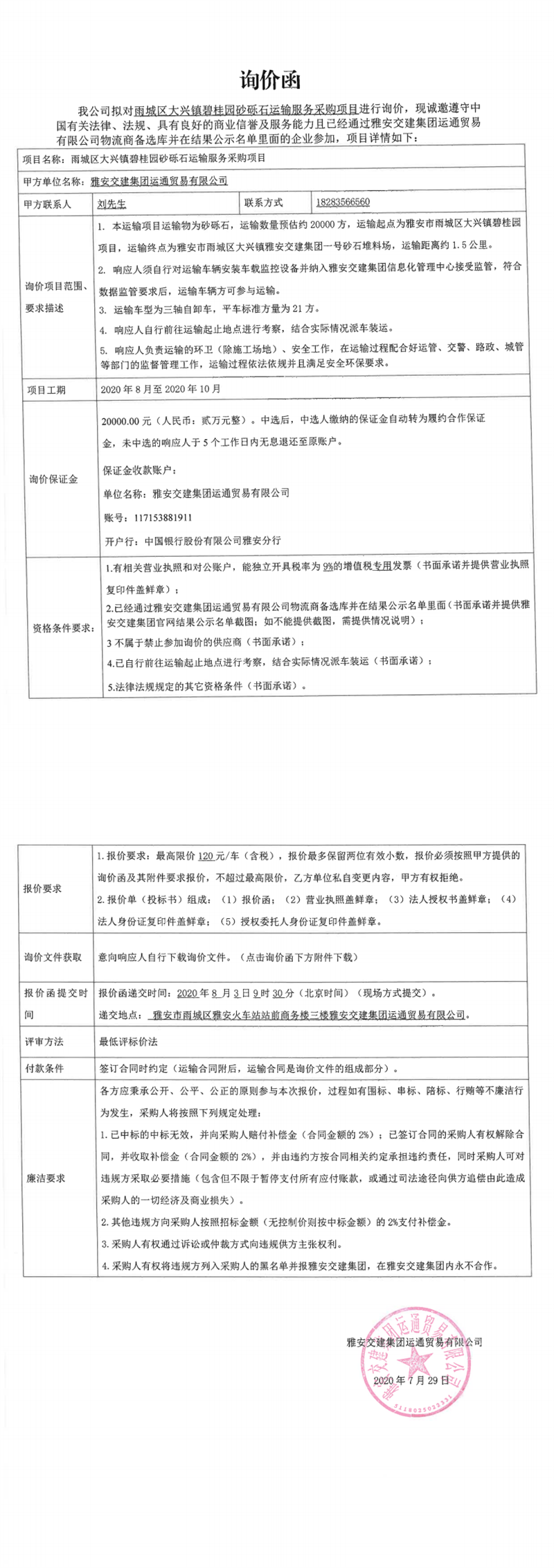 雅安交建集團運通貿(mào)易有限公司雨城區(qū)大興鎮(zhèn)碧桂園砂礫石運輸服務采購項目(第二次)詢價函