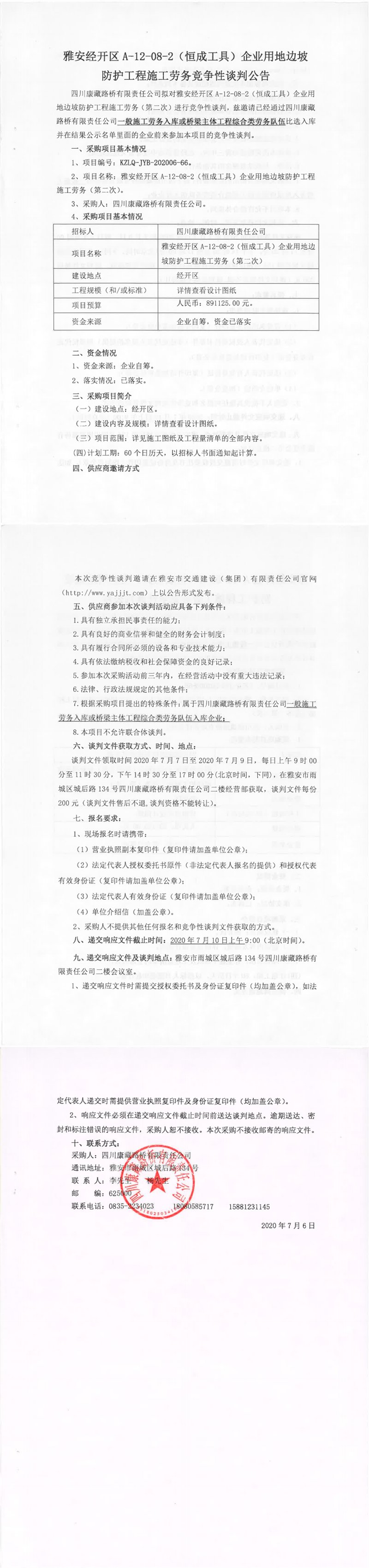四川康藏路橋有限責任公司雅安經(jīng)開區(qū)A-12-08-2(恒成工具)企業(yè)用地邊坡防護工程施工勞務(wù)(第二次)競爭性談判公告