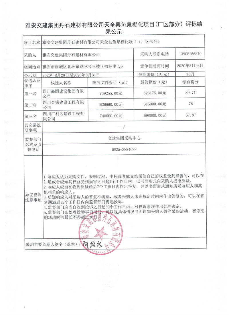 雅安交建集團(tuán)丹石建材有限公司天全縣魚泉棚化項(xiàng)目(廠區(qū)部分)評(píng)標(biāo)結(jié)果公示