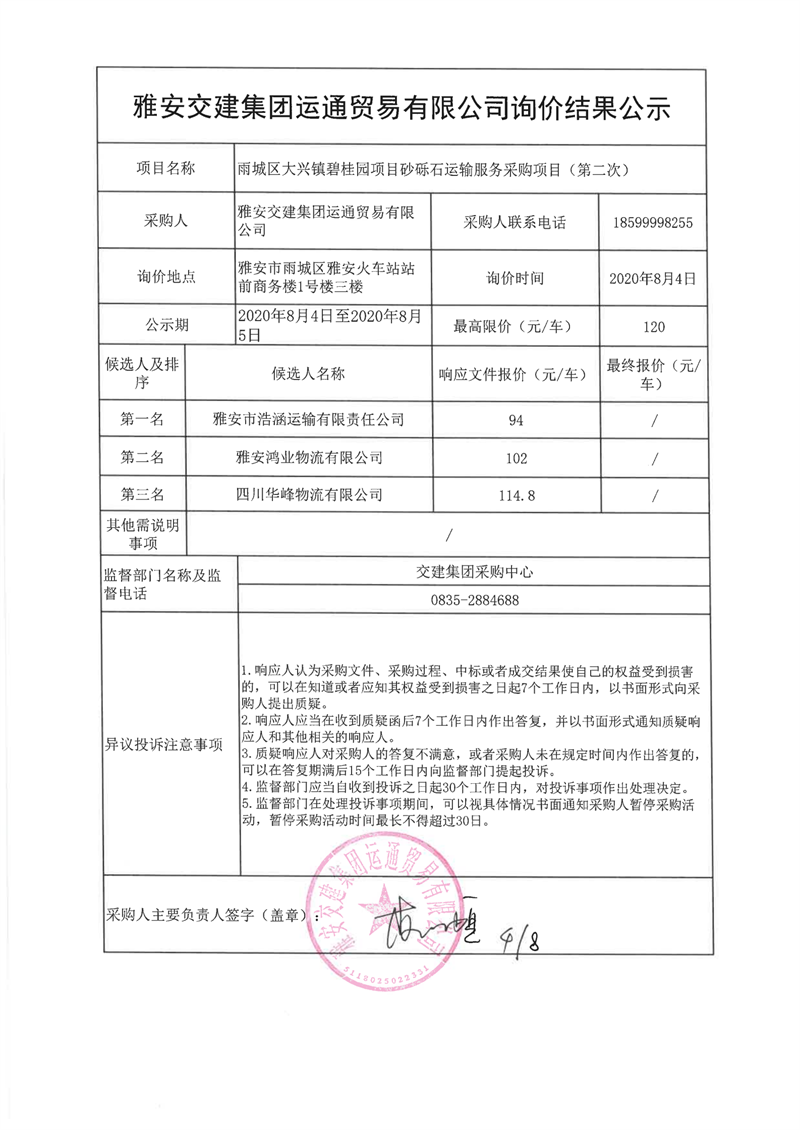 雅安交建集團(tuán)運(yùn)通貿(mào)易有限公司雨城區(qū)大興鎮(zhèn)碧桂園項目砂礫石運(yùn)輸服務(wù)采購項目(第二次)詢價結(jié)果公示