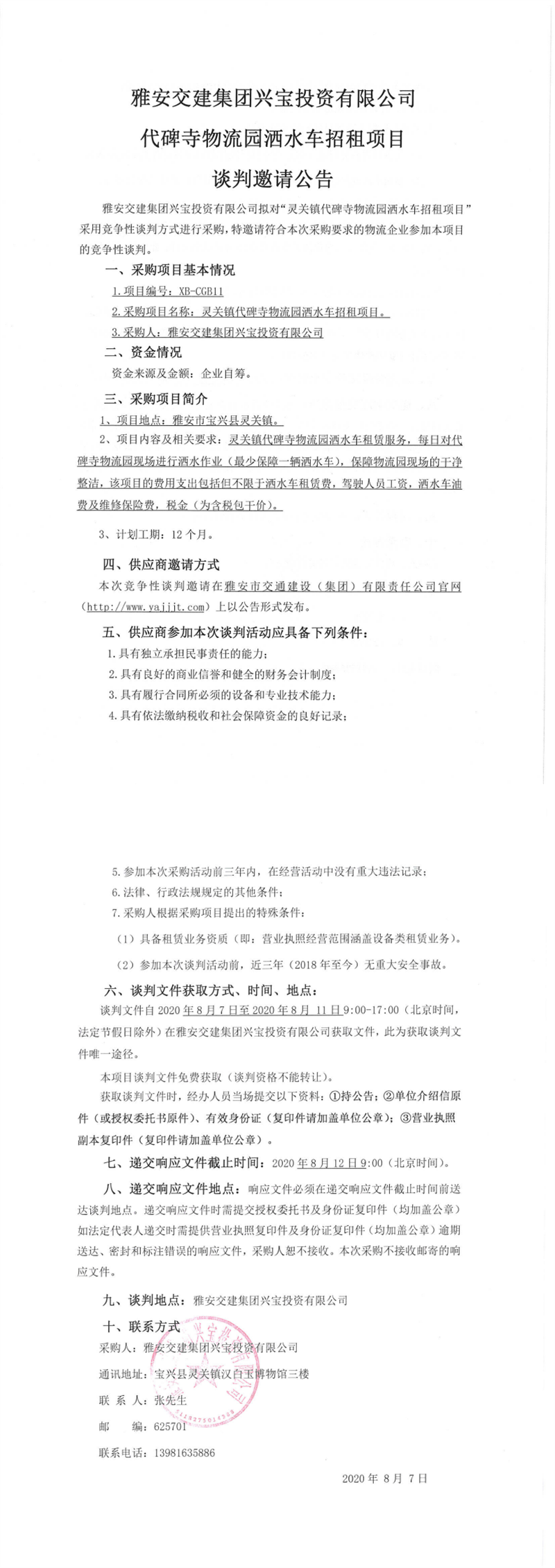 雅安交建集團(tuán)興寶投資有限公司代碑寺物流園灑水車招租項(xiàng)目談判邀請公告