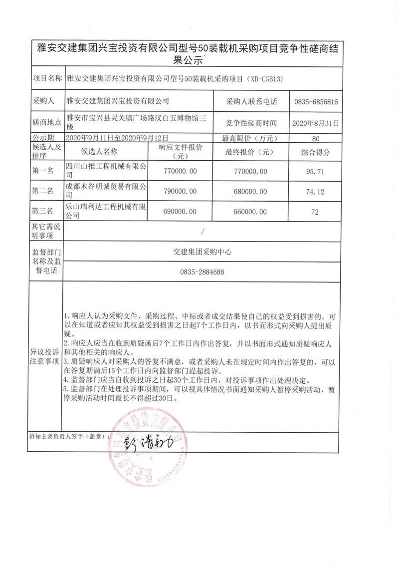 雅安交建集團興寶投資有限公司型號50裝載機采購項目競爭性磋商結(jié)果公示