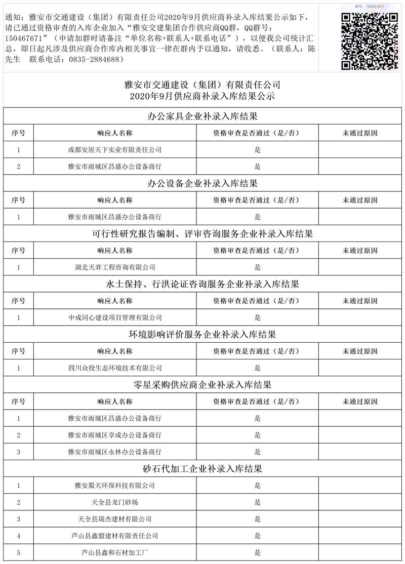 雅安市交通建設(shè)(集團(tuán))有限責(zé)任公司2020年9月供應(yīng)商補(bǔ)錄入庫結(jié)果公示
