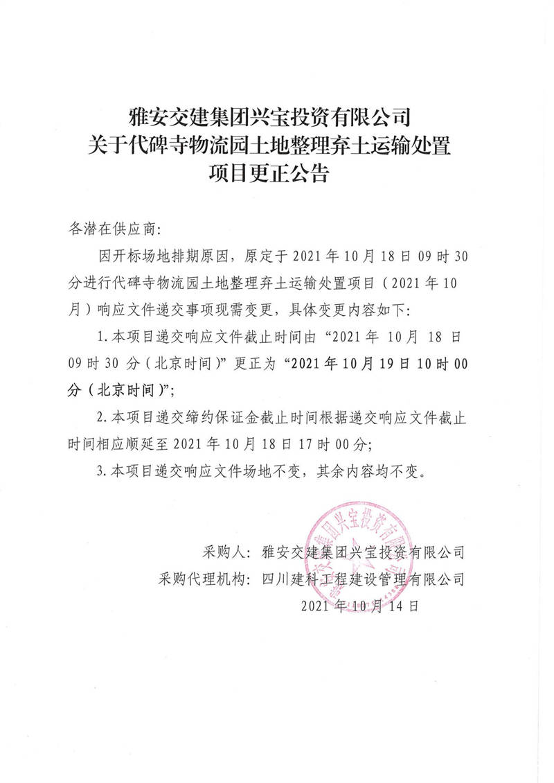 雅安交建集團興寶投資有限公司關于代碑寺物流園土地整理棄土運輸處置項目更正公告