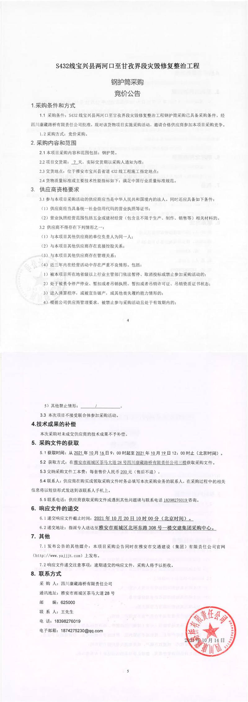 四川康藏路橋有限責(zé)任公司S432線寶興縣兩河口至甘孜界段災(zāi)毀修復(fù)整治工程鋼護(hù)筒采購競(jìng)價(jià)公告