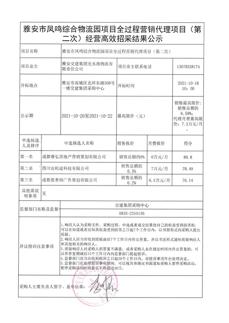 雅安交建集團(tuán)無水港物流有限責(zé)任公司雅安市鳳鳴綜合物流園項(xiàng)目全過程營銷代理項(xiàng)目(第二次)經(jīng)營高效招采結(jié)果公示