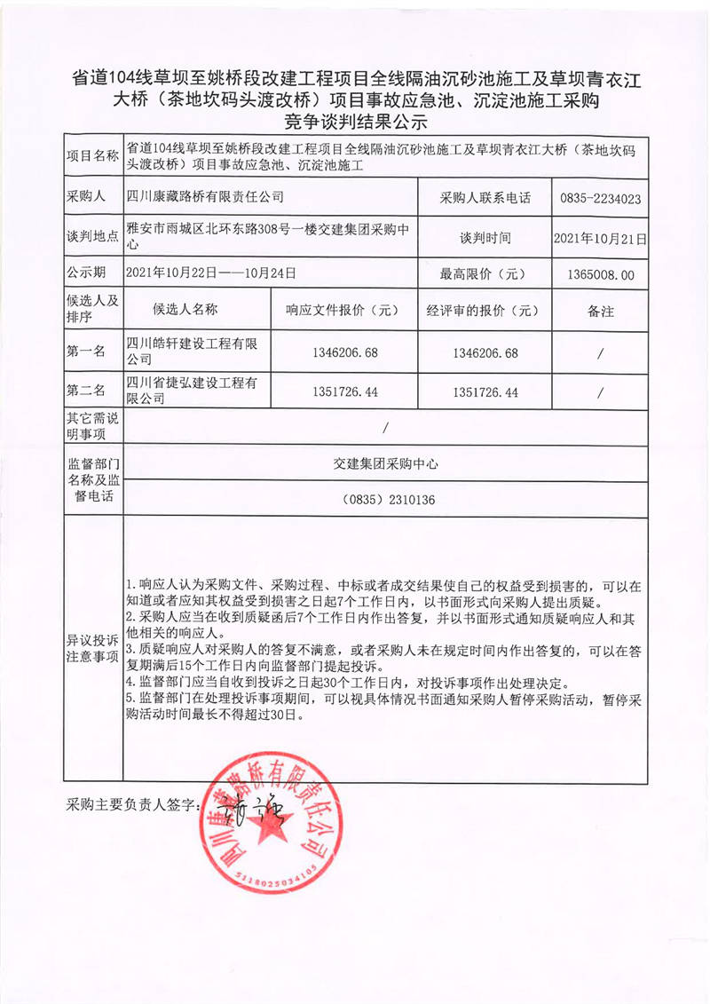 四川康藏路橋有限責(zé)任公司省道104線草壩至姚橋段改建工程項目全線隔油沉砂池施工及草壩青衣江大橋(茶地坎碼頭渡改橋)項目事故應(yīng)急池、沉淀池施工采購競爭談判結(jié)果公示