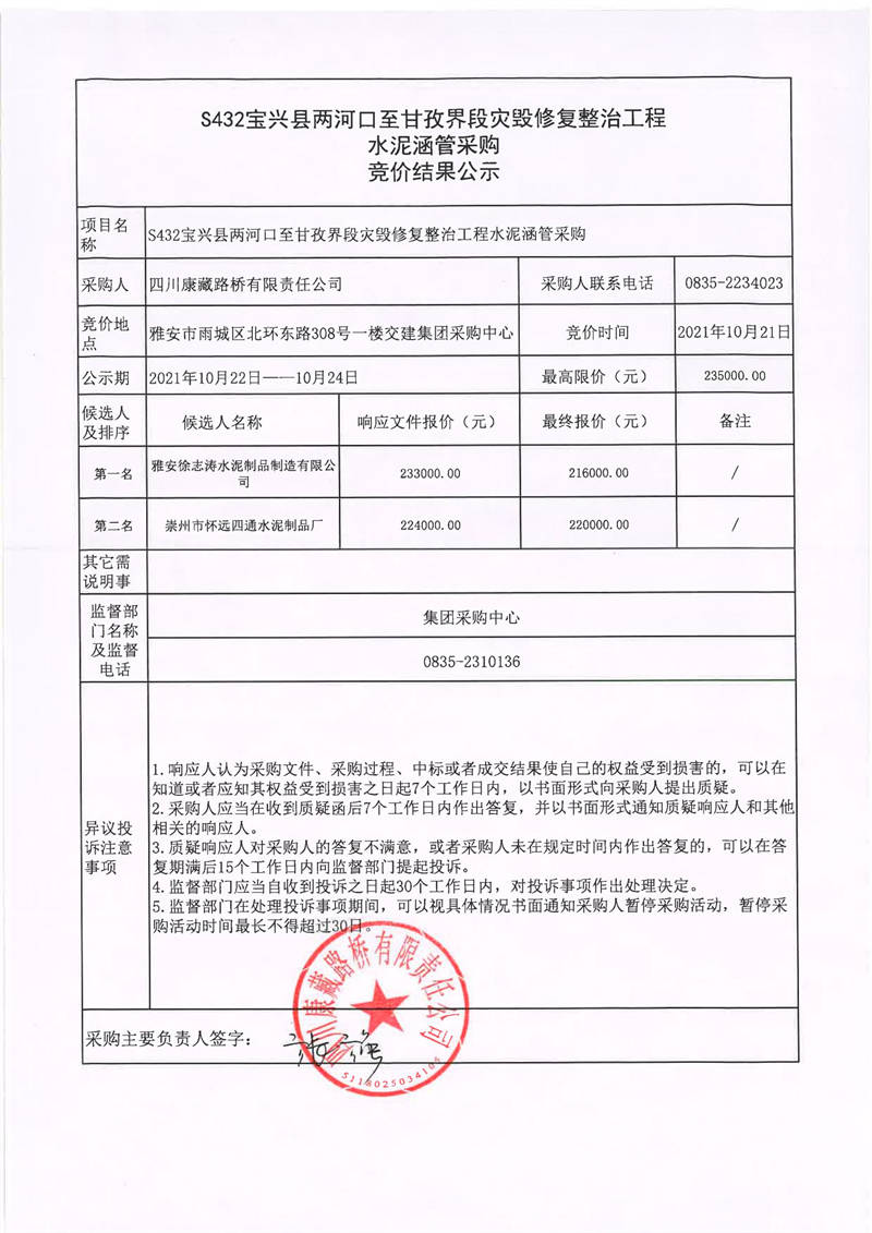 四川康藏路橋有限責任公司S432線寶興縣兩河口至甘孜界段災毀修復整治工程水泥涵管采購競價結果公示