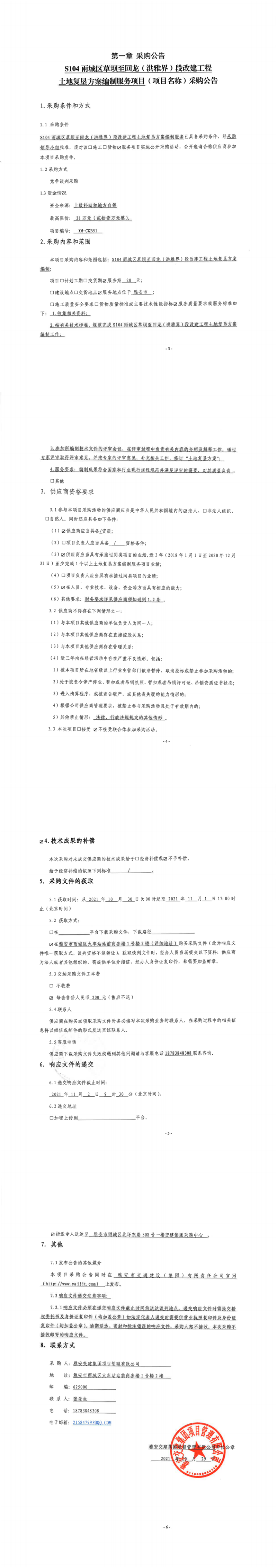 雅安交建集團(tuán)項(xiàng)目管理有限公司S104雨城區(qū)草壩至回龍(洪雅界)段改建工程土地復(fù)墾方案編制服務(wù)項(xiàng)目采購(gòu)公告