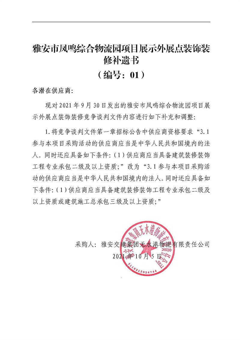 雅安交建集團無水港物流有限責任公司雅安市鳳鳴綜合物流園項目展示外展點裝飾裝修補遺書