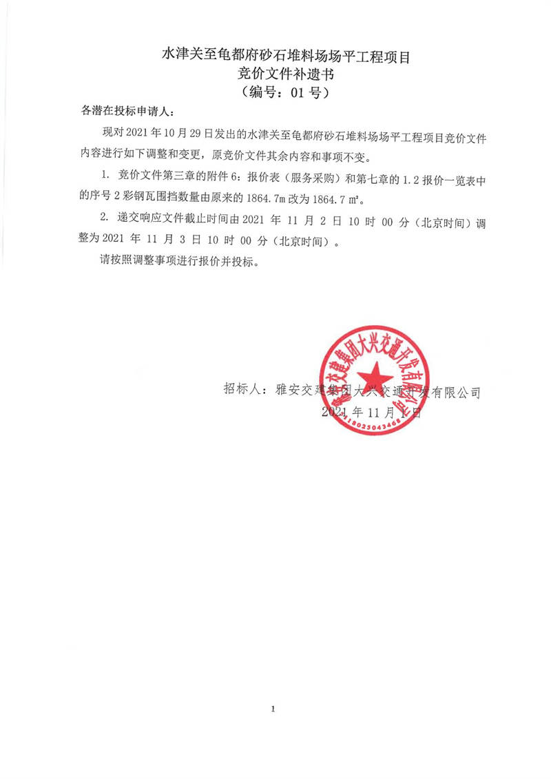 雅安交建集團(tuán)大興交通開(kāi)發(fā)有限公司水津關(guān)至龜都府砂石堆料場(chǎng)場(chǎng)平工程項(xiàng)目競(jìng)價(jià)文件補(bǔ)遺書(編號(hào):01號(hào))