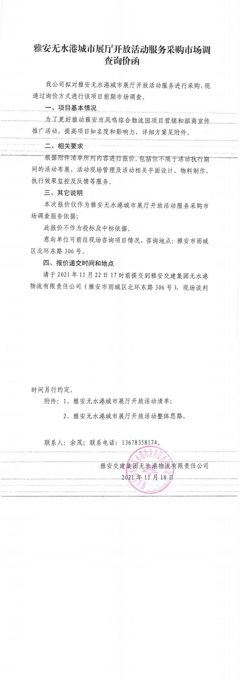 雅安交建集團(tuán)無(wú)水港物流有限責(zé)任公司雅安無(wú)水港城市展廳開(kāi)放活動(dòng)服務(wù)采購(gòu)市場(chǎng)調(diào)查詢(xún)價(jià)函