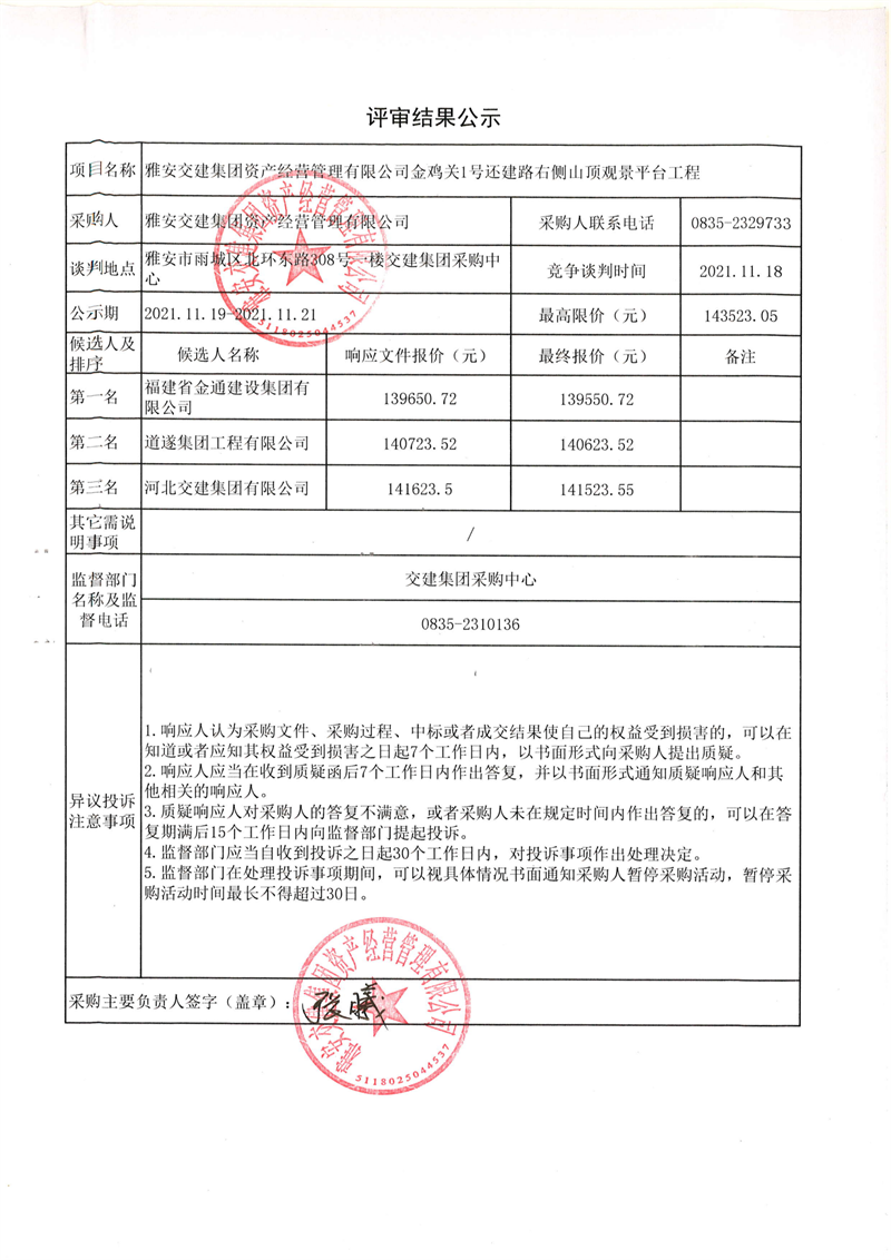 雅安交建集團(tuán)資產(chǎn)經(jīng)營管理有限公司金雞關(guān)1號(hào)還建路右側(cè)山頂觀景平臺(tái)工程評(píng)審結(jié)果公示