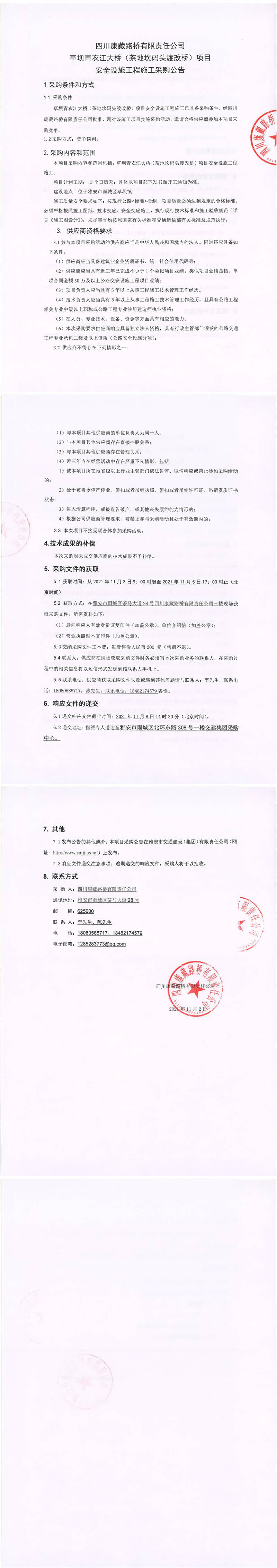 四川康藏路橋有限責(zé)任公司草壩青衣江大橋(茶地坎碼頭渡改橋)項(xiàng)目安全設(shè)施工程施工采購(gòu)公告