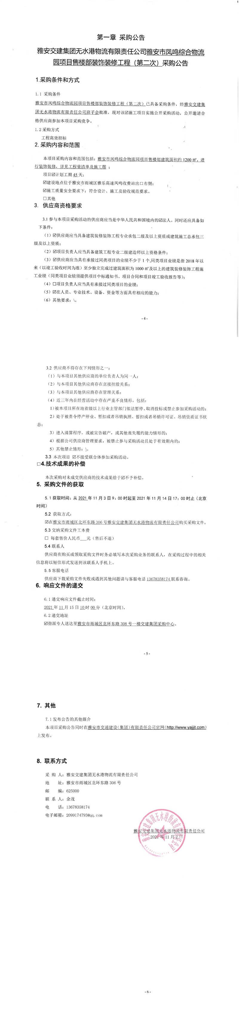 雅安交建集團無水港物流有限責任公司雅安市鳳鳴綜合物流園項目售樓部裝飾裝修工程(第二次)采購公告
