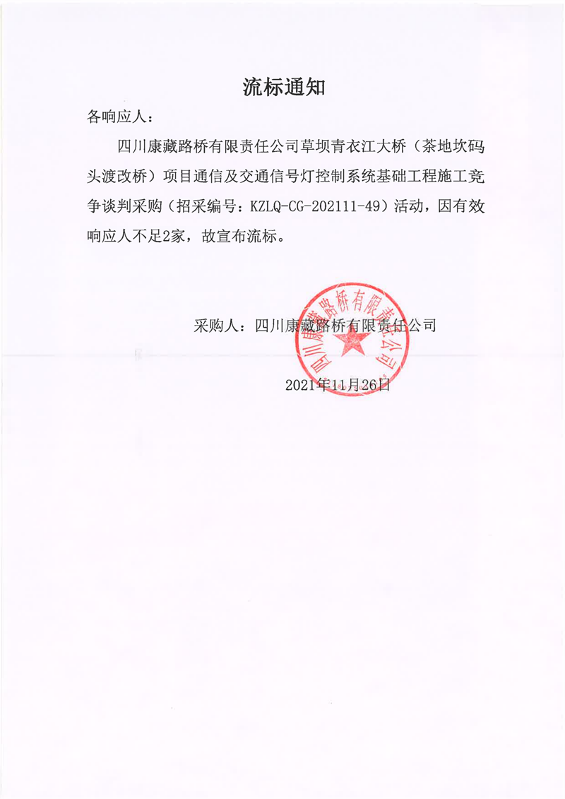 四川康藏路橋有限責(zé)任公司草壩青衣江大橋(茶地坎碼頭渡改橋)項目通信及交通信號燈控制系統(tǒng)基礎(chǔ)工程施工采購流標通知