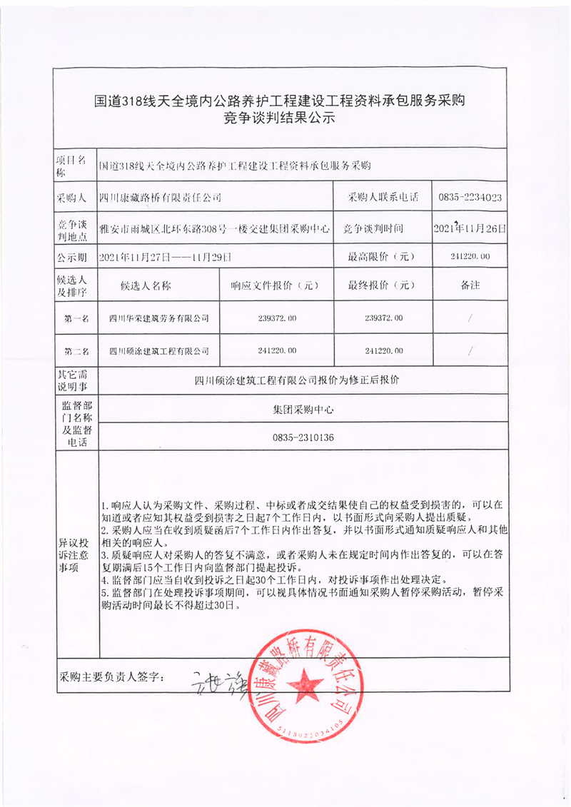 四川康藏路橋有限責(zé)任公司國道318線天全境內(nèi)公路養(yǎng)護(hù)工程建設(shè)工程資料承包服務(wù)采購競(jìng)爭(zhēng)談判結(jié)果公示