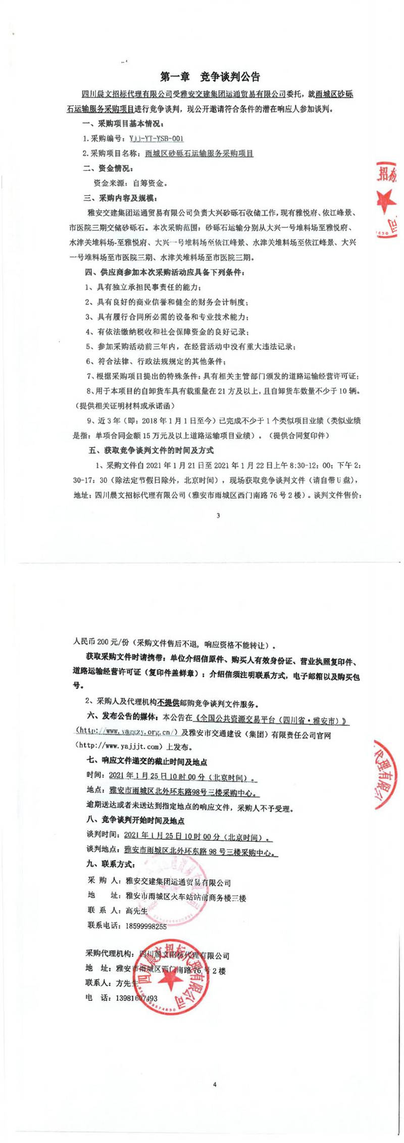 雅安交建集團(tuán)運(yùn)通貿(mào)易有限公司雨城區(qū)砂礫石運(yùn)輸服務(wù)采購項(xiàng)目競(jìng)爭(zhēng)談判公告