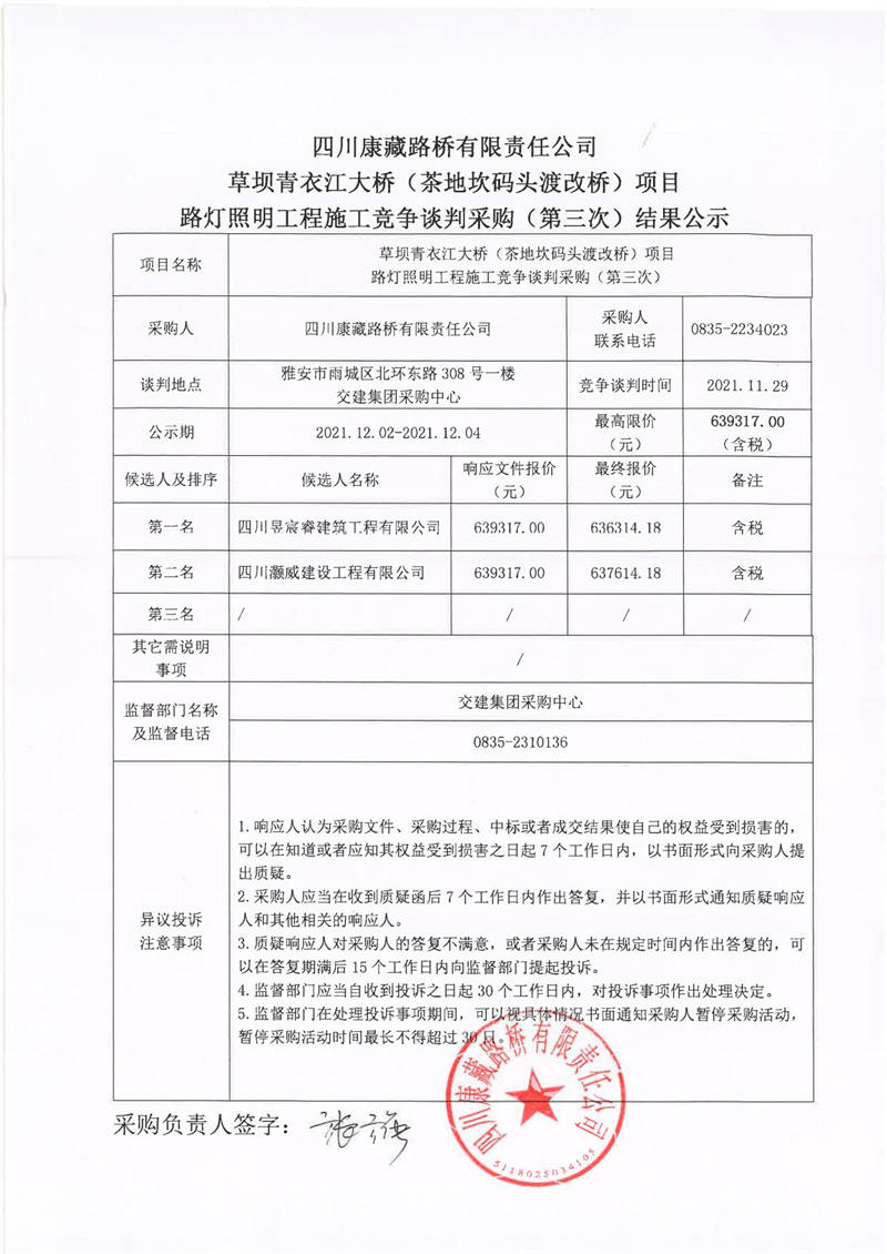 四川康藏路橋有限責任公司草壩青衣江大橋(茶地坎碼頭渡改橋)項目路燈照明工程施工競爭談判采購(第三次)結(jié)果公示