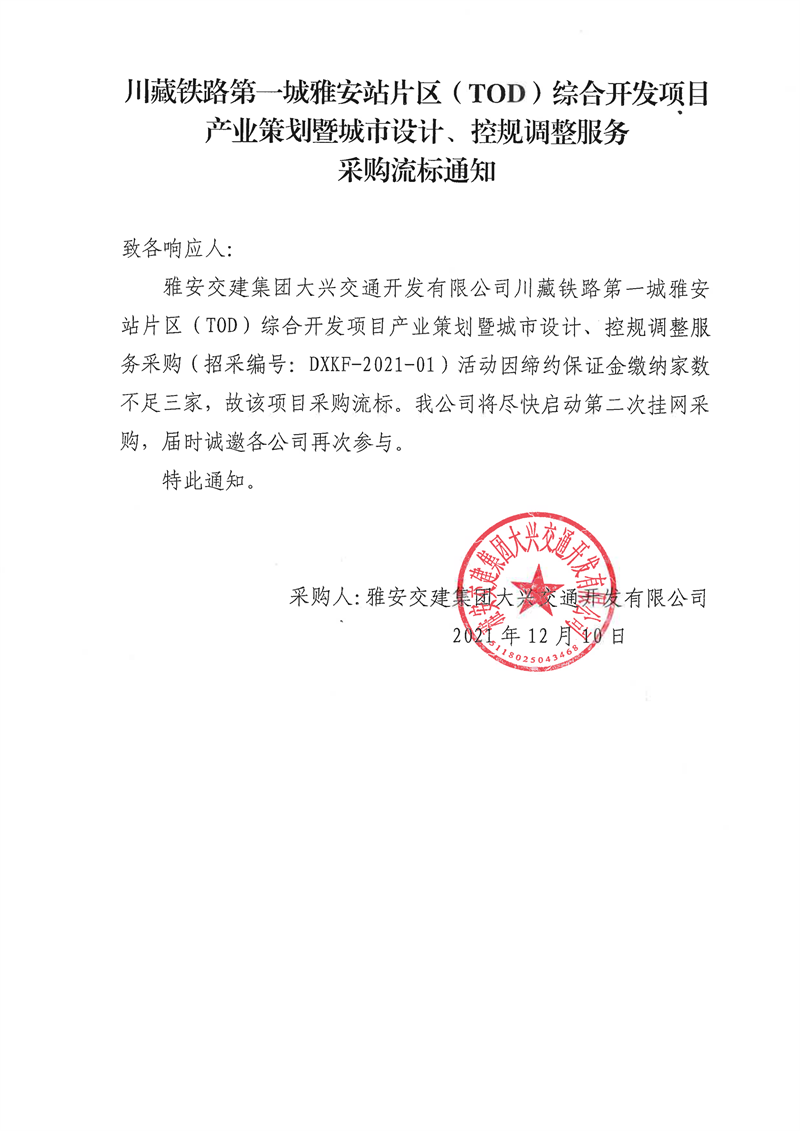 雅安交建集團大興交通開發(fā)有限公司川藏鐵路第一城雅安站片區(qū)(TOD)綜合開發(fā)項目產(chǎn)業(yè)策劃暨城市設(shè)計、控規(guī)調(diào)整服務(wù)采購流標(biāo)通知