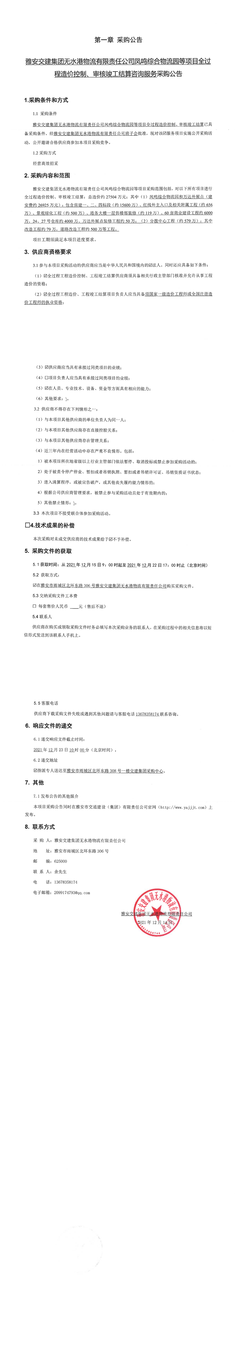 雅安交建集團無水港物流有限責(zé)任公司鳳鳴綜合物流等項目全過程造價控制、審核竣工結(jié)算咨詢服務(wù)采購公告