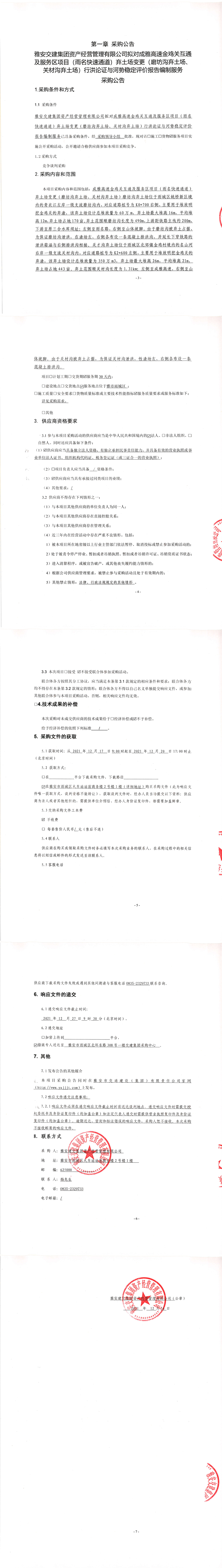 雅安交建集團資產(chǎn)經(jīng)營管理有限公司擬對成雅高速金雞關(guān)互通及服務(wù)區(qū)項目(雨名快速通道)棄土場變更(磨坊溝棄土場、關(guān)材溝棄土場)行洪論證與河勢穩(wěn)定評價報告編制服務(wù)采購公告