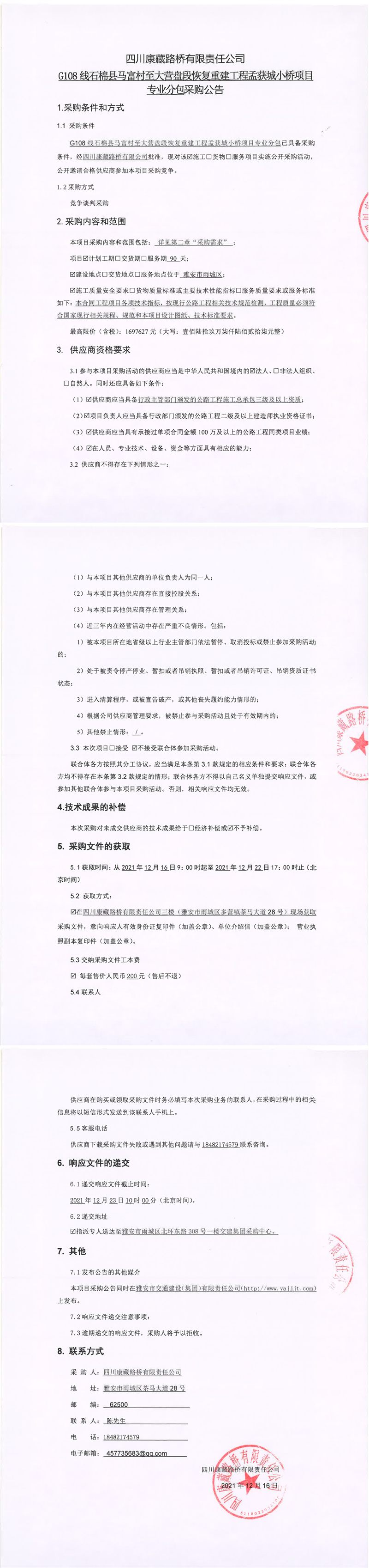 四川康藏路橋有限責任公司G108線石棉縣馬富村至大營盤段恢復(fù)重建工程孟獲城小橋項目專業(yè)分包采購公告