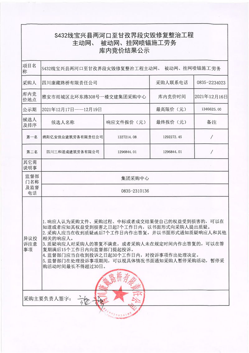四川康藏路橋有限責(zé)任公司S432線寶興縣兩河口至甘孜界段災(zāi)毀修復(fù)整治工程主動網(wǎng)、補動網(wǎng)、掛網(wǎng)噴錨施工勞務(wù)庫內(nèi)競價結(jié)果公示