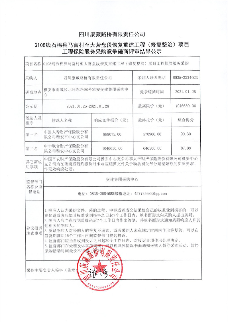 四川康藏路橋有限責(zé)任公司G108線石棉縣馬富村至大營盤段恢復(fù)重建工程(修復(fù)整治)項(xiàng)目工程保險(xiǎn)服務(wù)采購競爭磋商評審結(jié)果公示