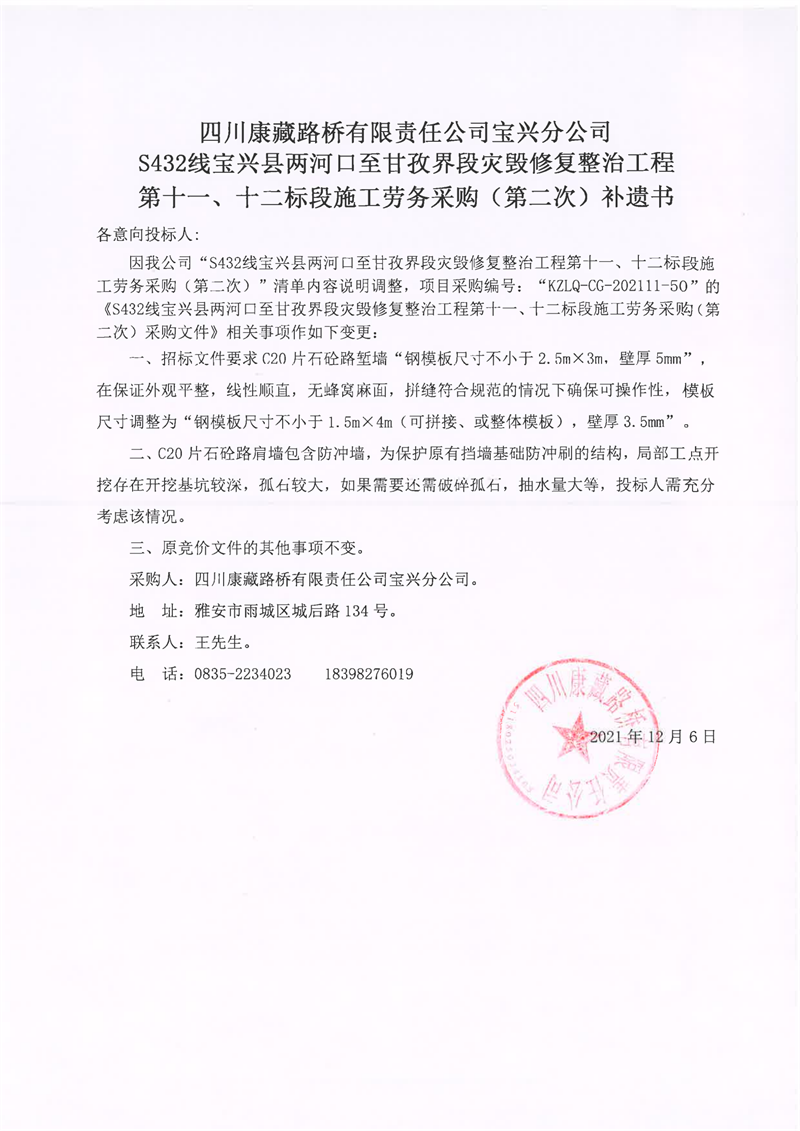 四川康藏路橋有限責(zé)任公司S432線寶興縣兩河口至甘孜界段災(zāi)毀修復(fù)整治工程第十一、十二標(biāo)段施工勞務(wù)采購(gòu)(第二次)補(bǔ)遺書(shū)