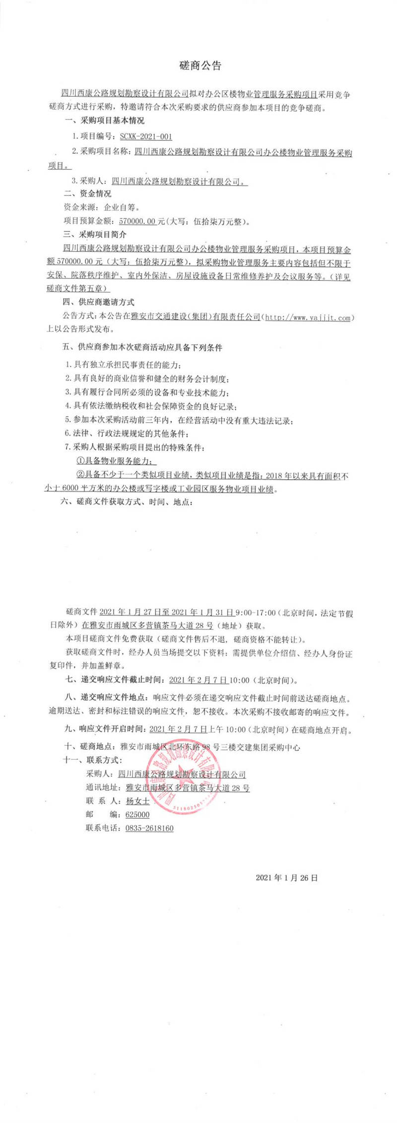 四川西康公路規(guī)劃勘察設(shè)計有限公司辦公樓物業(yè)管理服務(wù)采購項目競爭磋商公告