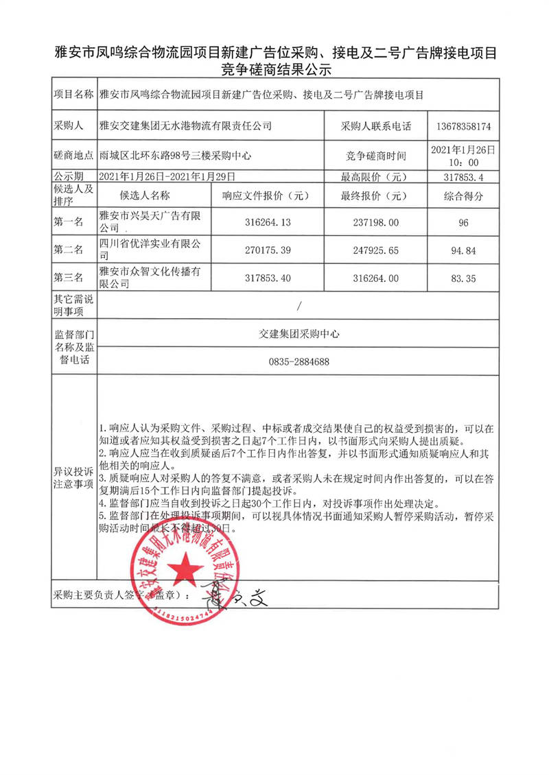 雅安交建集團(tuán)無水港物流有限責(zé)任公司雅安市鳳鳴綜合物流園項目新建廣告位采購、接電及二號廣告牌接電項目競爭磋商結(jié)果公示