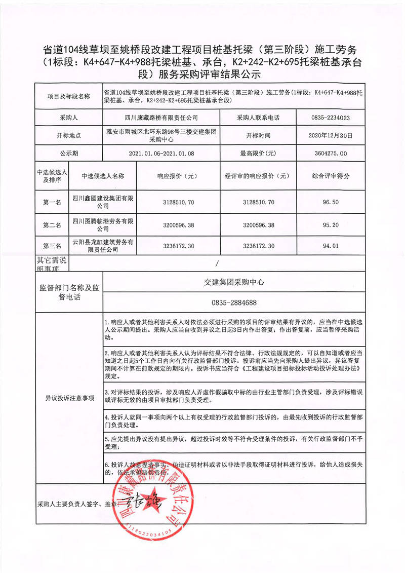 四川康藏路橋有限責任公司省道104線草壩至姚橋段改建工程項目樁基托梁(第三階段)施工勞務(wù)服務(wù)1標段采購評審結(jié)果公示