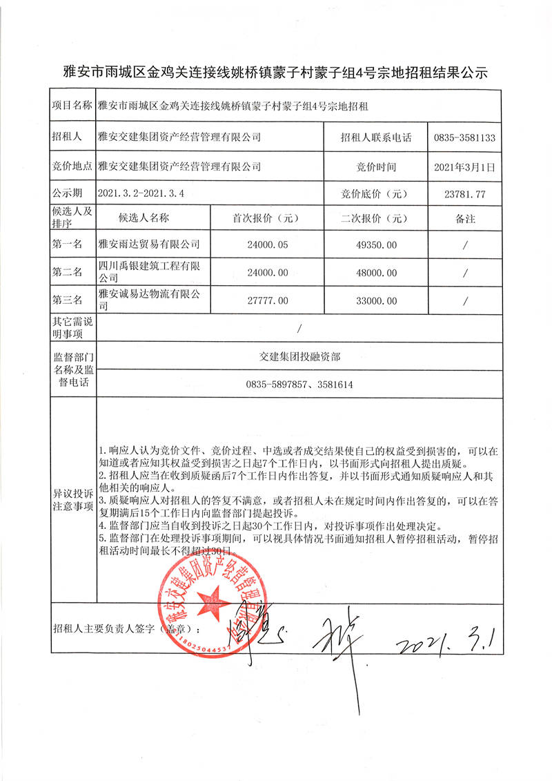 雅安交建集團(tuán)資產(chǎn)經(jīng)營管理有限公司雅安市雨城區(qū)金雞關(guān)連接線姚橋鎮(zhèn)蒙子村蒙子組4號宗地招租結(jié)果公示