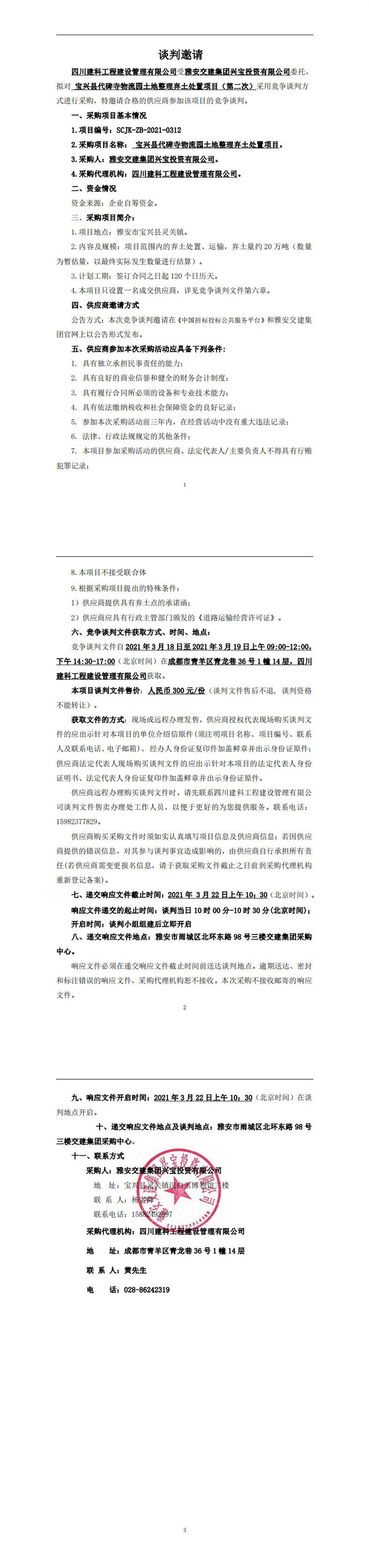 雅安交建集團(tuán)興寶投資有限公司寶興縣代碑寺物流園土地整理?xiàng)壨撂幹庙?xiàng)目(第二次)競(jìng)爭(zhēng)談判公告