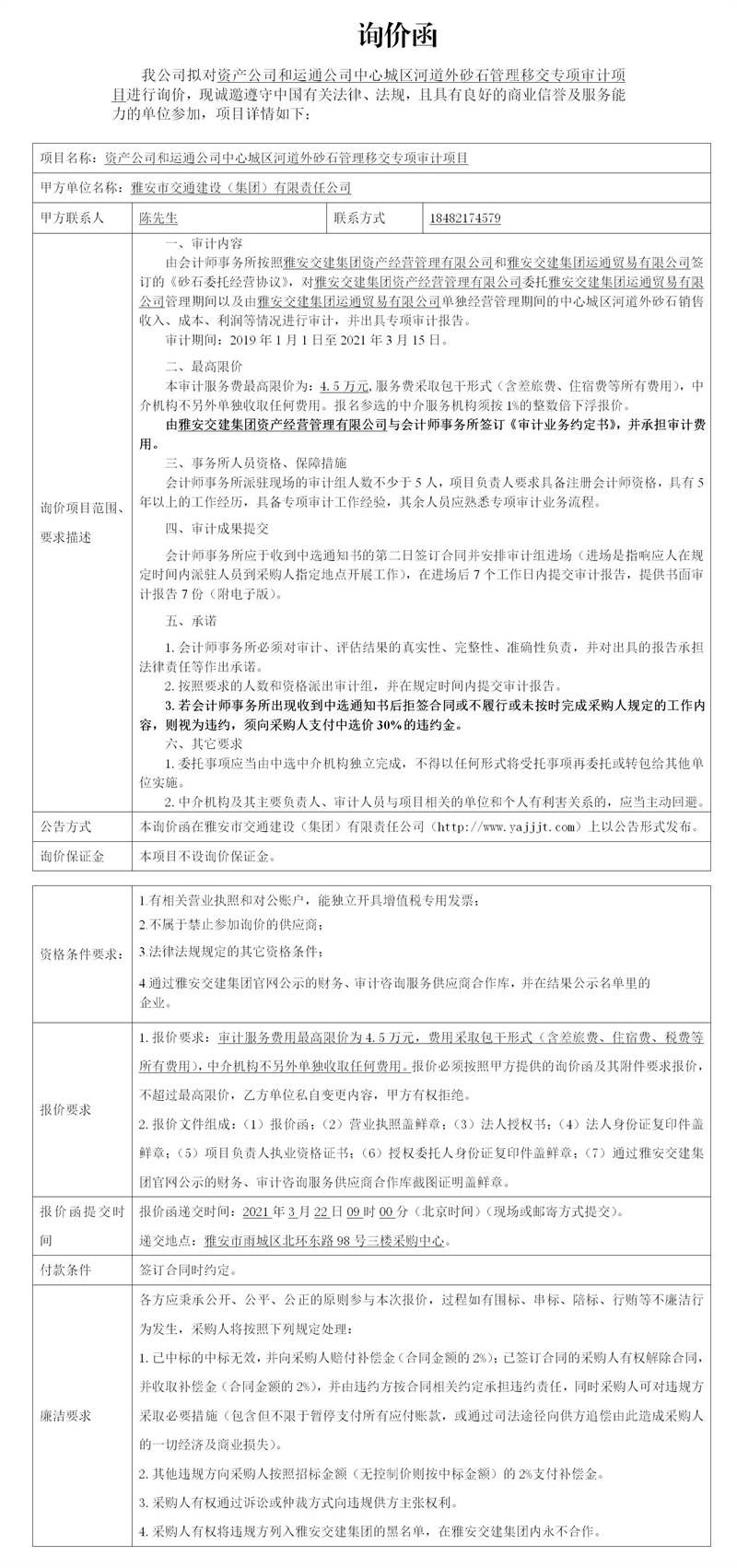 雅安市交通建設(shè)(集團)有限責(zé)任公司資產(chǎn)公司和運通公司中心城區(qū)河道外砂石管理移交專項審計項目詢價函
