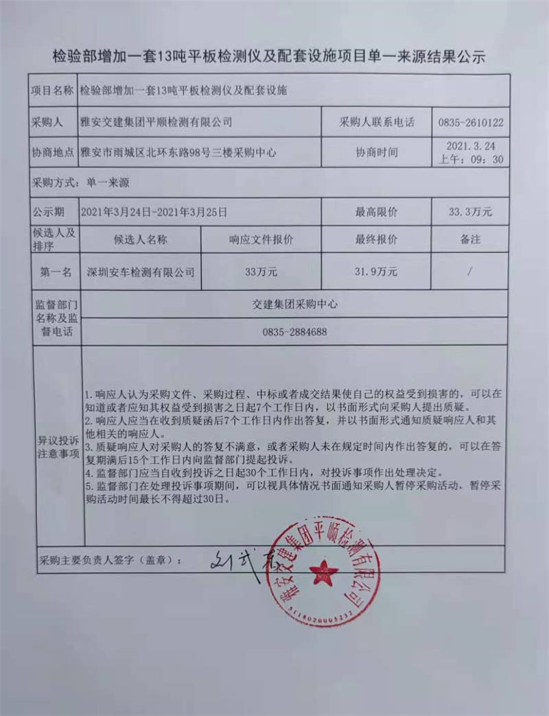 雅安交建集團(tuán)平順檢測(cè)有限公司檢驗(yàn)部增加一套13噸平板檢測(cè)儀及配套設(shè)施項(xiàng)目單一來(lái)源結(jié)果公示