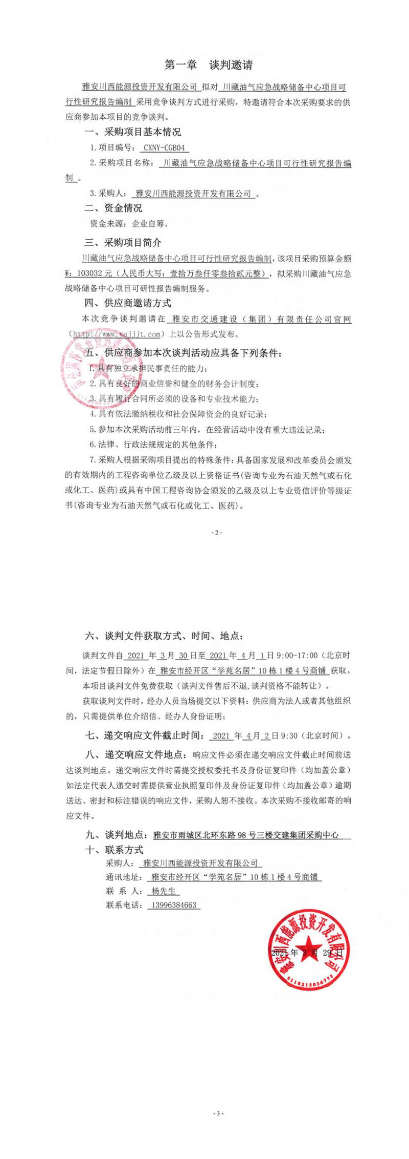 雅安川西能源投資開(kāi)發(fā)有限公司川藏油氣應(yīng)急戰(zhàn)略?xún)?chǔ)備中心項(xiàng)目可行性研究報(bào)告編制競(jìng)爭(zhēng)談判公告