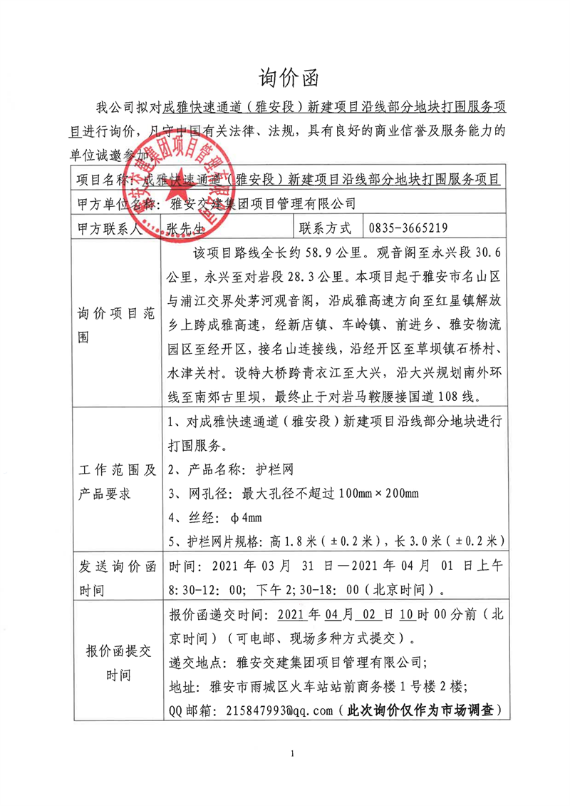 雅安交建集團(tuán)項(xiàng)目管理有限公司成雅快速通道(雅安段)新建項(xiàng)目沿線部分地塊打圍服務(wù)項(xiàng)目詢價(jià)函