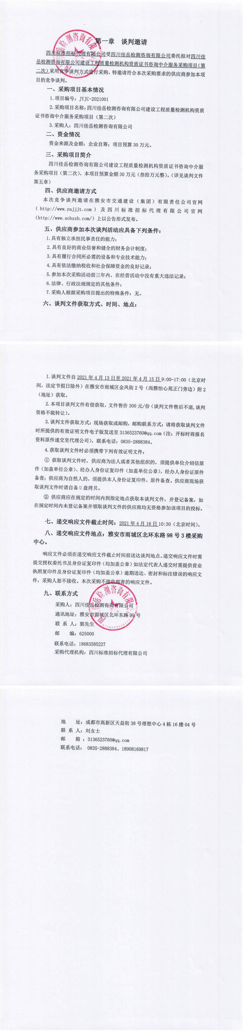 四川佳岳檢測(cè)咨詢有限公司建設(shè)工程質(zhì)量檢測(cè)機(jī)構(gòu)資質(zhì)證書(shū)咨詢中介服務(wù)采購(gòu)項(xiàng)目(第二次)競(jìng)爭(zhēng)談判公告