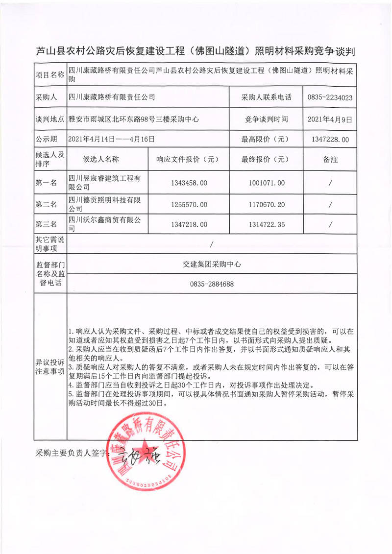 四川康藏路橋有限責任公司蘆山縣農(nóng)村公路災(zāi)后恢復建設(shè)工程(佛圖山隧道)照明材料采購競爭談判結(jié)果公示