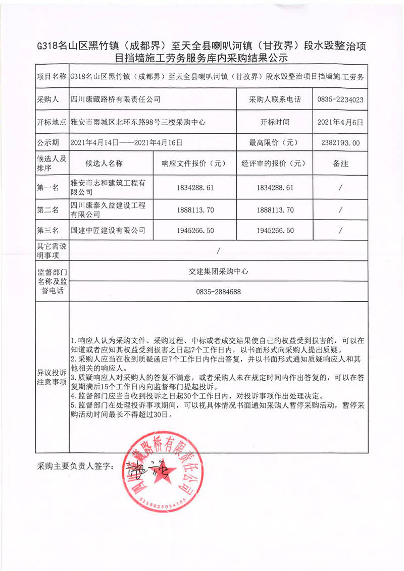 四川康藏路橋有限責任公司G318名山區(qū)黑竹鎮(zhèn)(成都界)至天全縣喇叭河鎮(zhèn)(甘孜界)段水毀整治項目擋墻施工勞務服務庫內采購結果公示