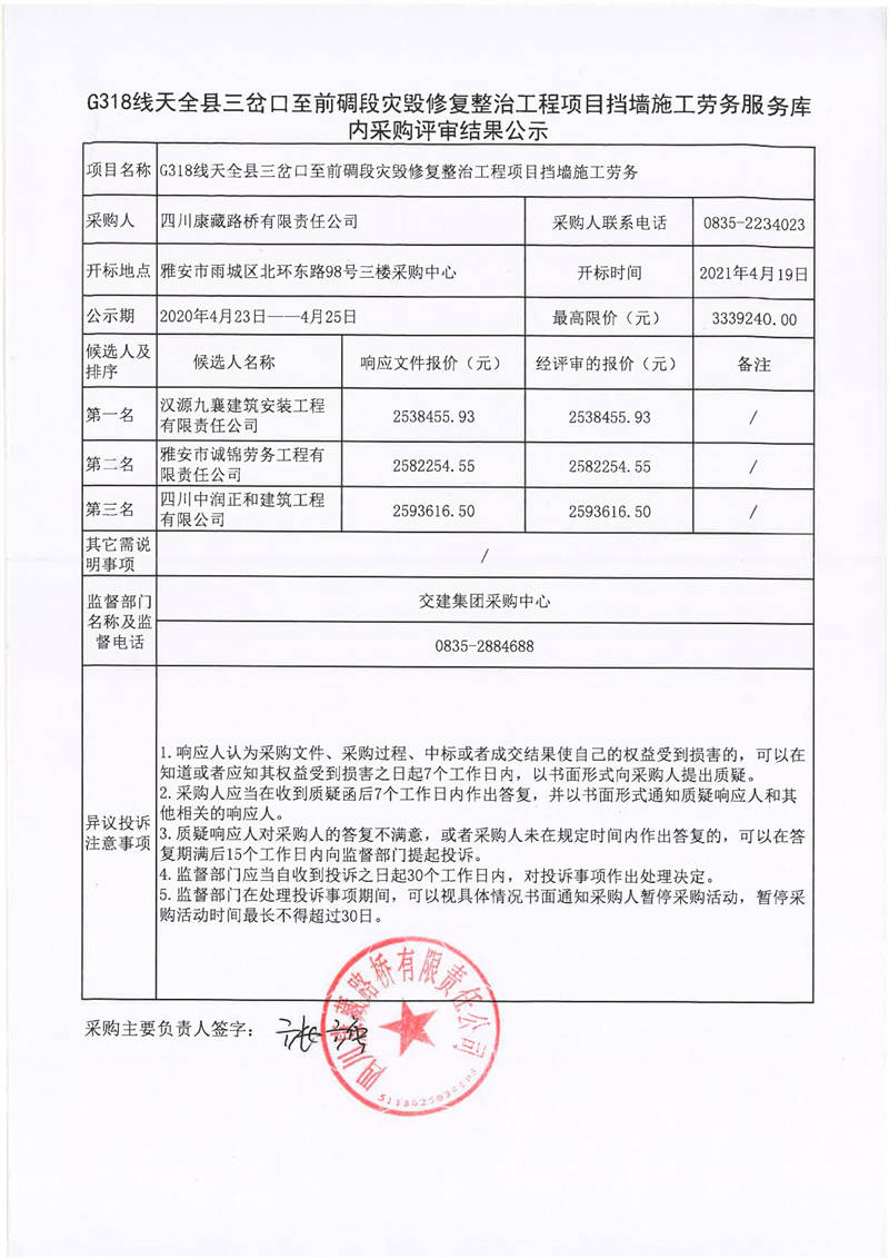 四川康藏路橋有限責任公司G318線天全縣三岔口至前碉段災毀修復整治工程項目擋墻施工勞務服務庫內(nèi)采購評審結果公示