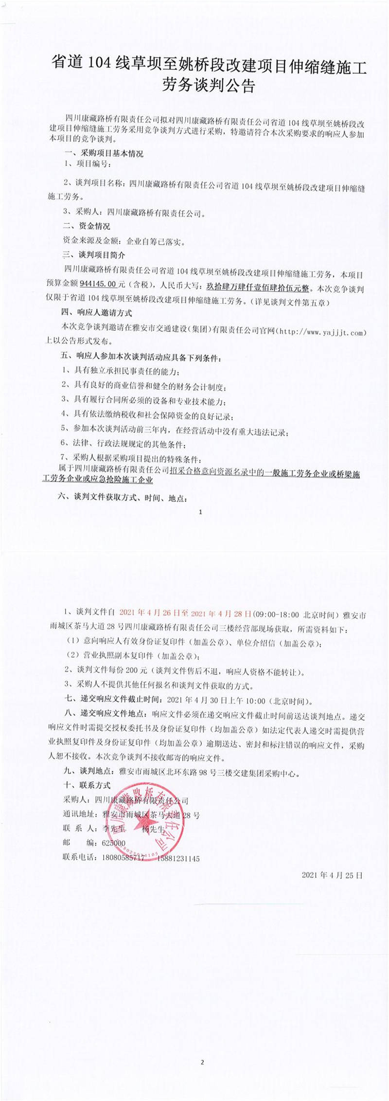 四川康藏路橋有限責(zé)任公司省道104線(xiàn)草壩至姚橋段改建項(xiàng)目伸縮縫施工勞務(wù)談判公告